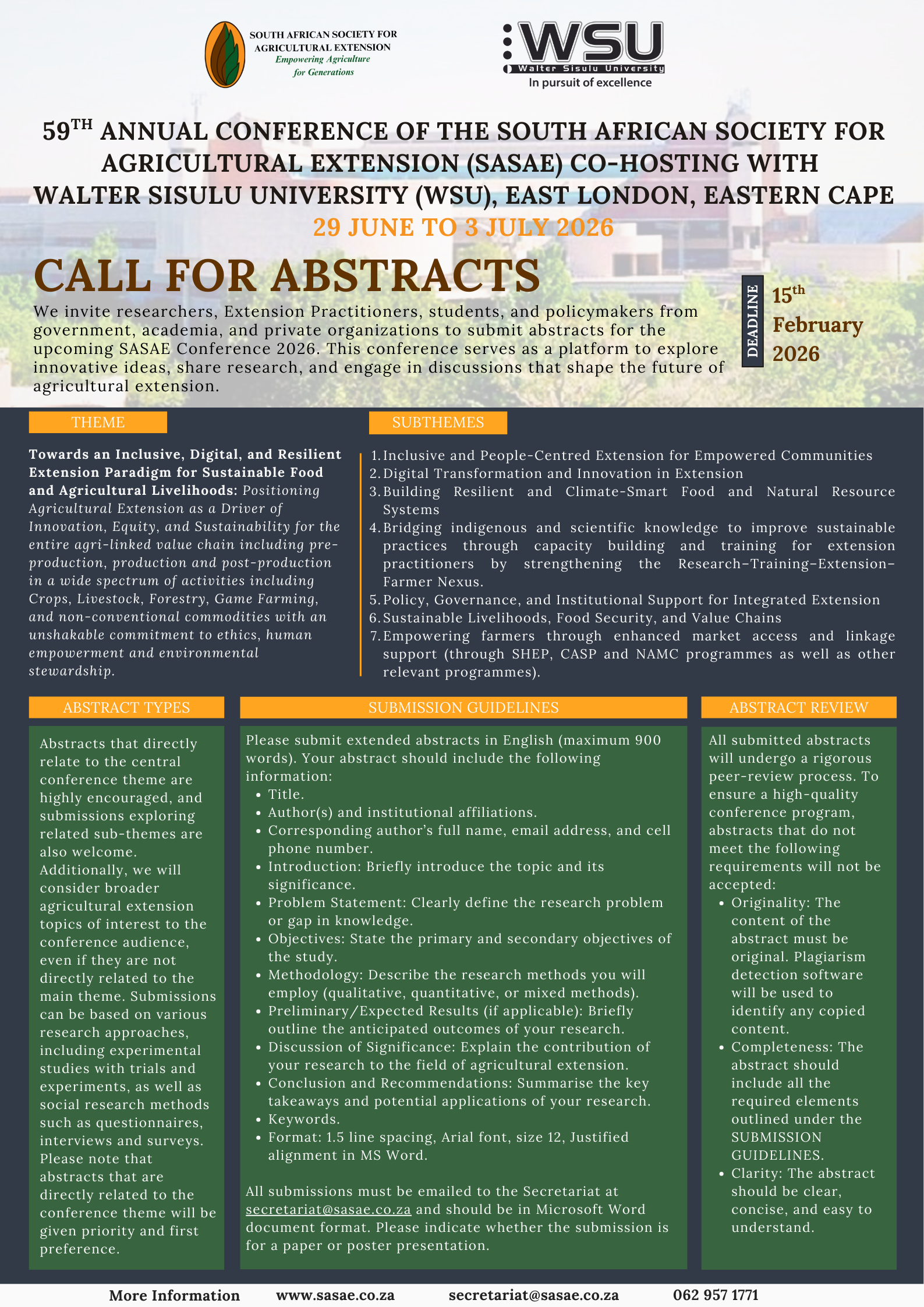 We invite researchers, Extension Practitioners, students, and policymakers from government, academia, and private organizations to submit abstracts for the upcoming SASAE Conference 2026. This conference serves as a platform to explore innovative ideas, share research, and engage in discussions that shape the future of agricultural extension.